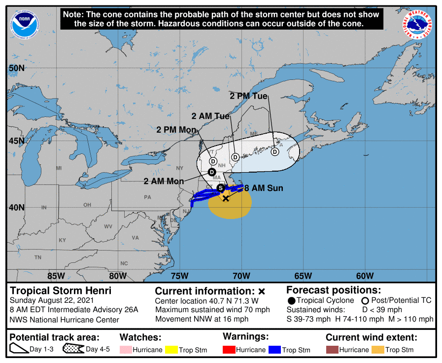 The National Weather Service reports that tropical storm Henri remains on track to slam into southern New England Sunday morning and is expected to bring severe flooding, very high winds and historic power outages along its path.